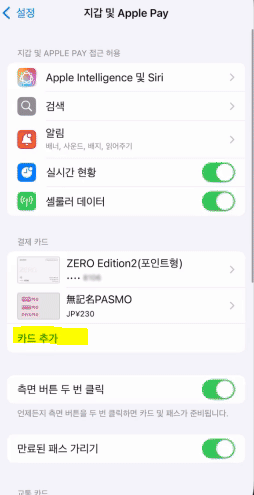 - [지갑 및 Apple Pay] → [카드 추가] 선택
