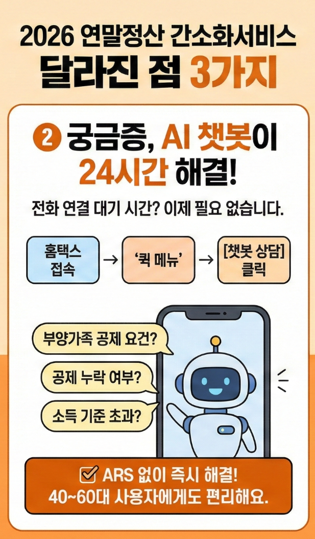 - 부양가족 공제 요건, 공제 누락 여부, 소득 기준 초과 여부 등 24시간 자동 안내