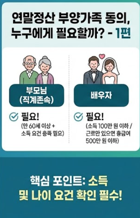 | 부모님 (직계존속) | 필요 | 만 60세 이상 + 소득 요건 충족 필요 |