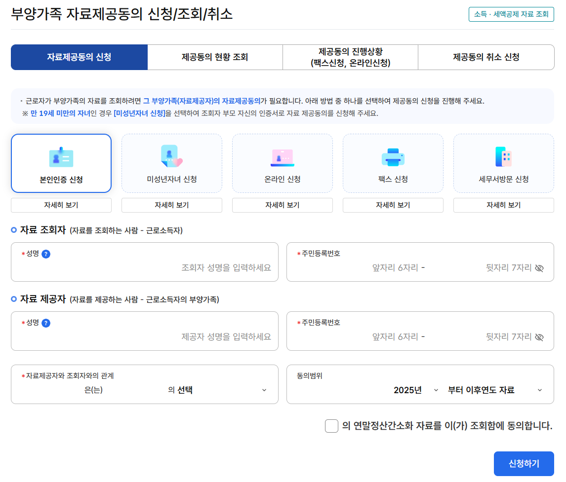 - 신청 경로: 홈택스 > 연말정산 간소화 > 자료제공동의 신청